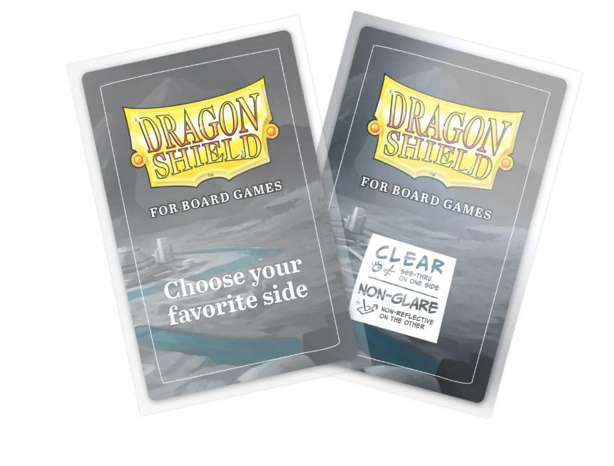 Our sleeves for board games are made to last and designed leveraging our 25 years of experience keeping games safe and helping players relax and enjoy worry-free game nights.Dragon Shield for Board Games keep your cards safe from spilled drinks and greasy fingers, make shuffling easy and keep your games looking pristine without being marred by dings and scratches.The unique combination of both a Clear and a Non-Glare side makes the shuffle feel delightfully smooth, while letting you decide which side to use for the front of the card and which to use for the back depending on your preference.Each pack comes with 100 European Standard sleeves that fit board game cards measuring up to 59x92 mm. Keep the box to store and neatly organize cards in your games – it fits 70+ sleeved cards.Great for games like Wyrmspan™, Concordia™, Agricola™ & many more!