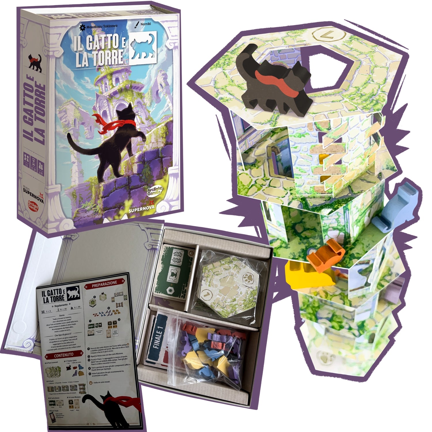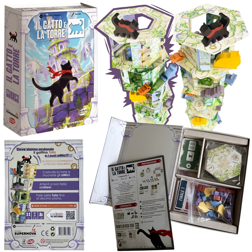 Il Gatto e la Torre è un commovente gioco cooperativo di tattica e destrezza, in cui bisogna collaborare per costruire la torre e posizionare gli amici del gattino Toto in determinate posizioni in modo da permettergli di salire in cima... tutto questo, ovviamente, senza mai far cadere la torre! Più si riesce a far salire Toto più si scoprono dettagli sulla sua storia, in un crescendo narrativo pieno di emozioni e momenti di riflessione.NUMERO GIOCATORI: 1-5DIFFICOLTA': FacileTIPOLOGIA: Gioco di Destrezza, CooperativoDUTATA: 15-30 Min
